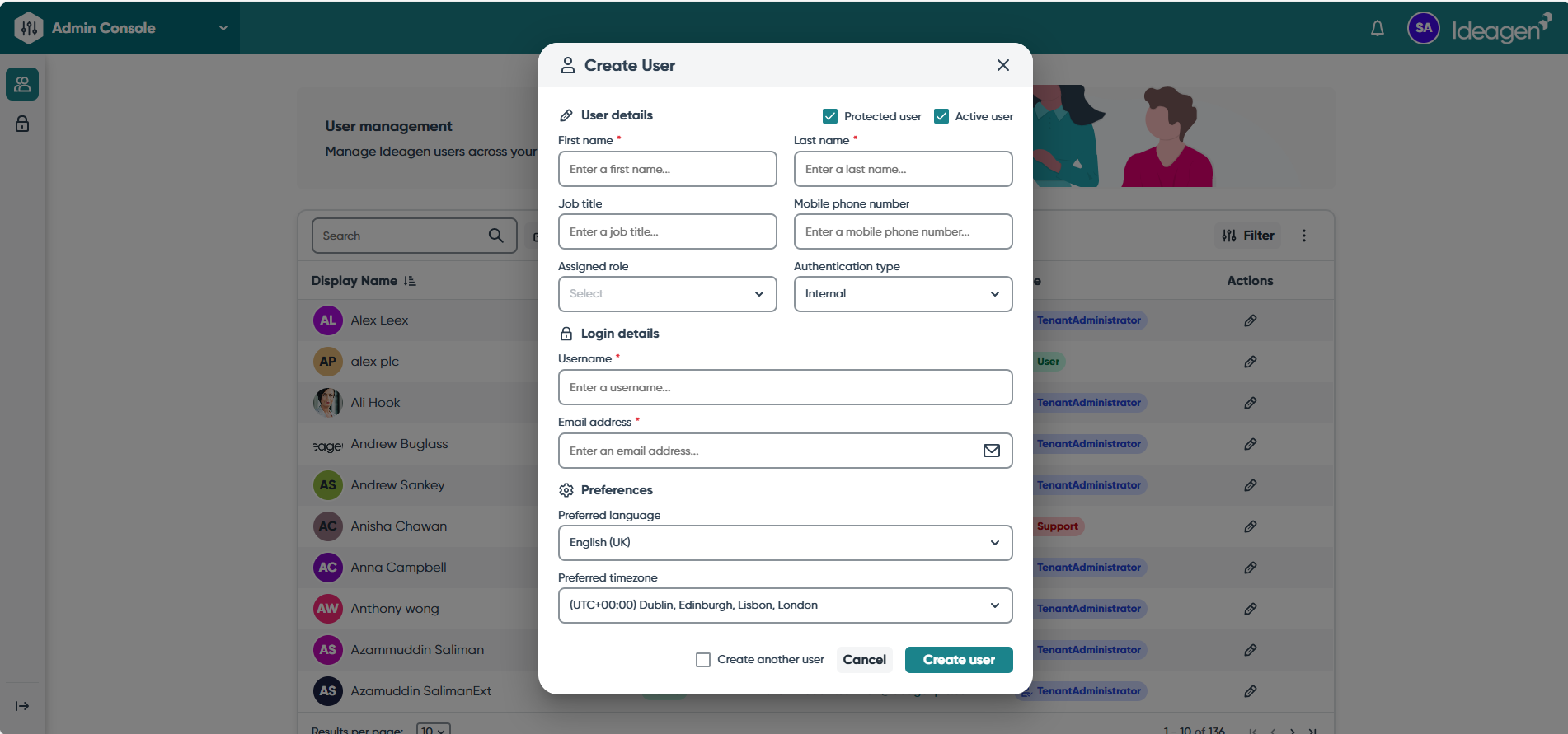 Tenant Administrators have access to all user account details and actions, including those of other Tenant Administrators. However, no user can delete their own account, even if they have been assigned the Tenant Administrator role. Note also that once a Username is created, it cannot be edited.