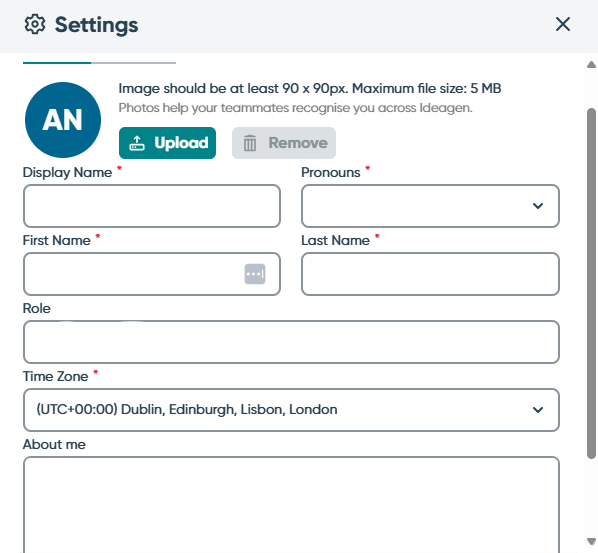 Fields marked with an asterisk are mandatory. - Click Upload to add a photo of yourself.