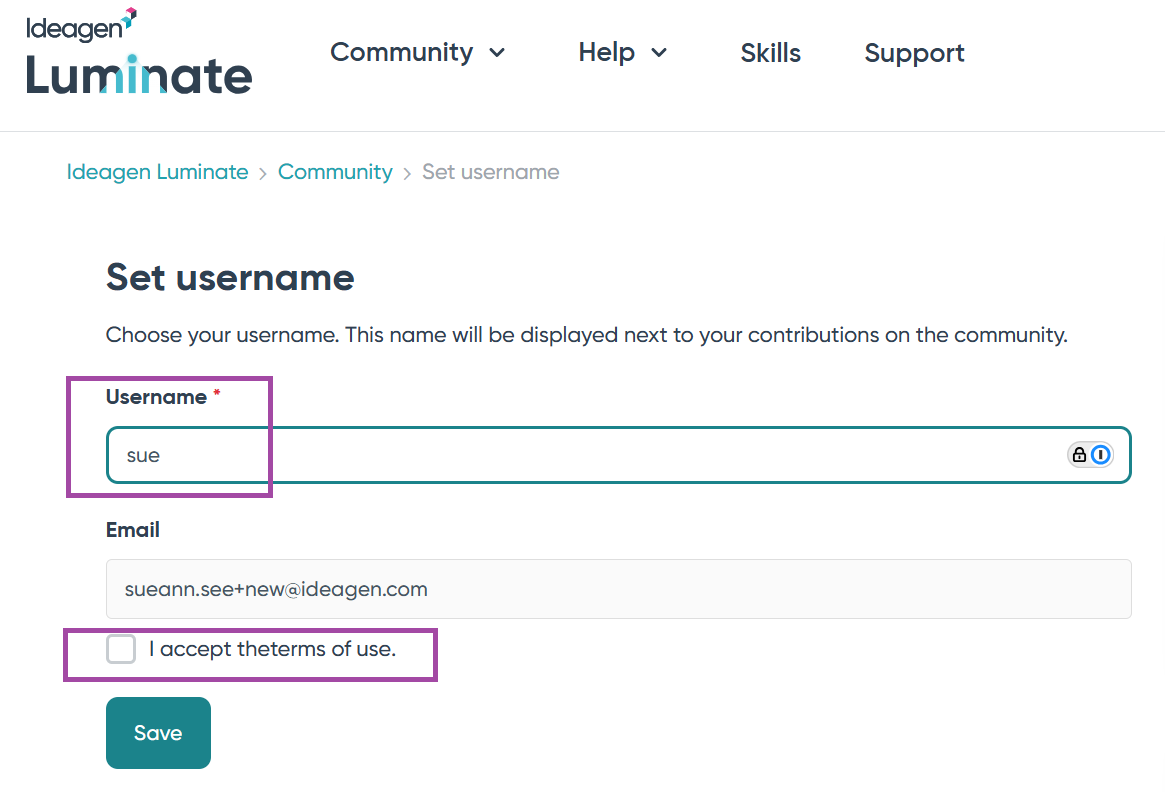 If it is your first time signing in to Community, you will be asked to set a username and accept the terms of use.
