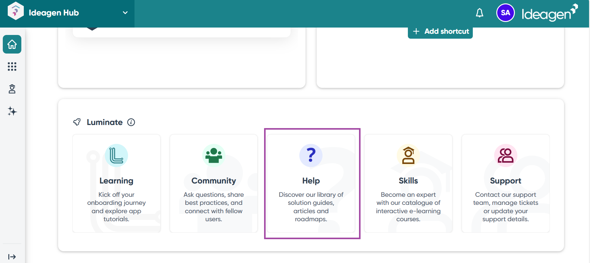 If you have a question or issue relating to Ideagen Hub and the integrated apps, you can access all areas of Ideagen Luminate, our customer experience portal, directly from the Hub interface.