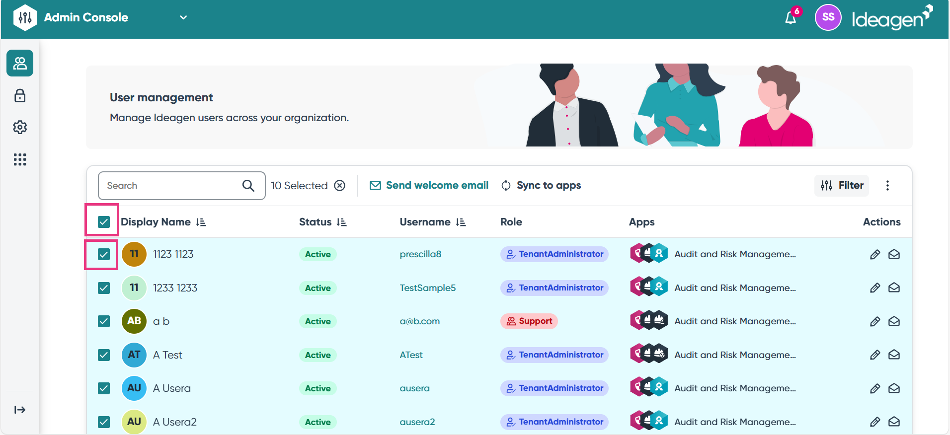 - Please select the checkboxes next to the users you'd like to send a welcome email to, or use the checkbox in the header column to quickly select all users shown on this page.