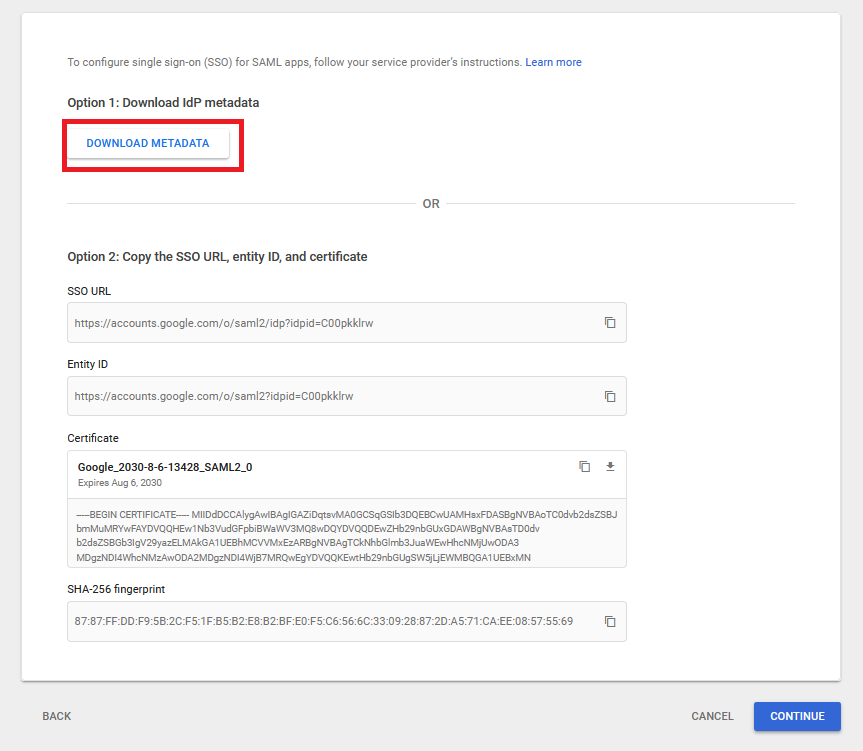 You will need the SAML metadata from your Google Workspace SAML app to complete the configuration on Ideagen Hub.