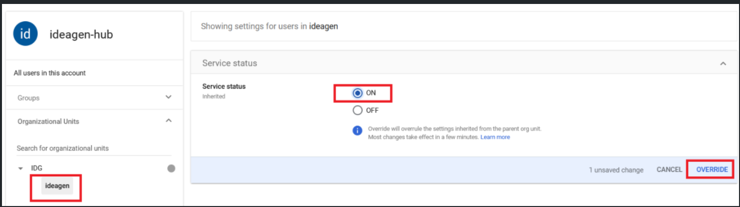 - You can assign users by “Groups” or “Organization Units”. In the screenshot below, we assign an Organization Unit, turn the Service status to “ON”, and click “OVERRIDE” to save the changes.