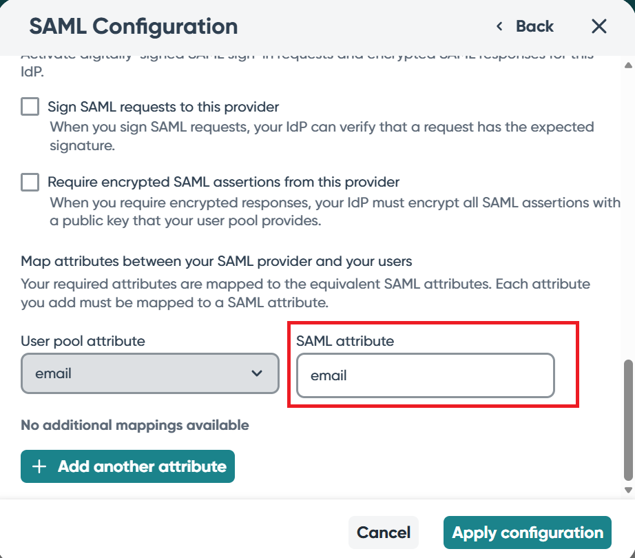 - At Ideagen Hub, SAML Configuration, map the user pool attribute email to the App attribute you specified in Google Workspace, in our example, being email.