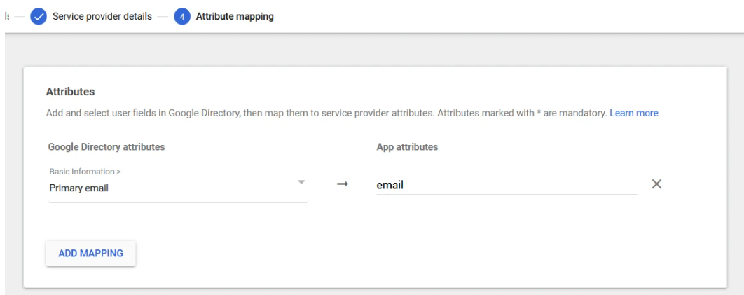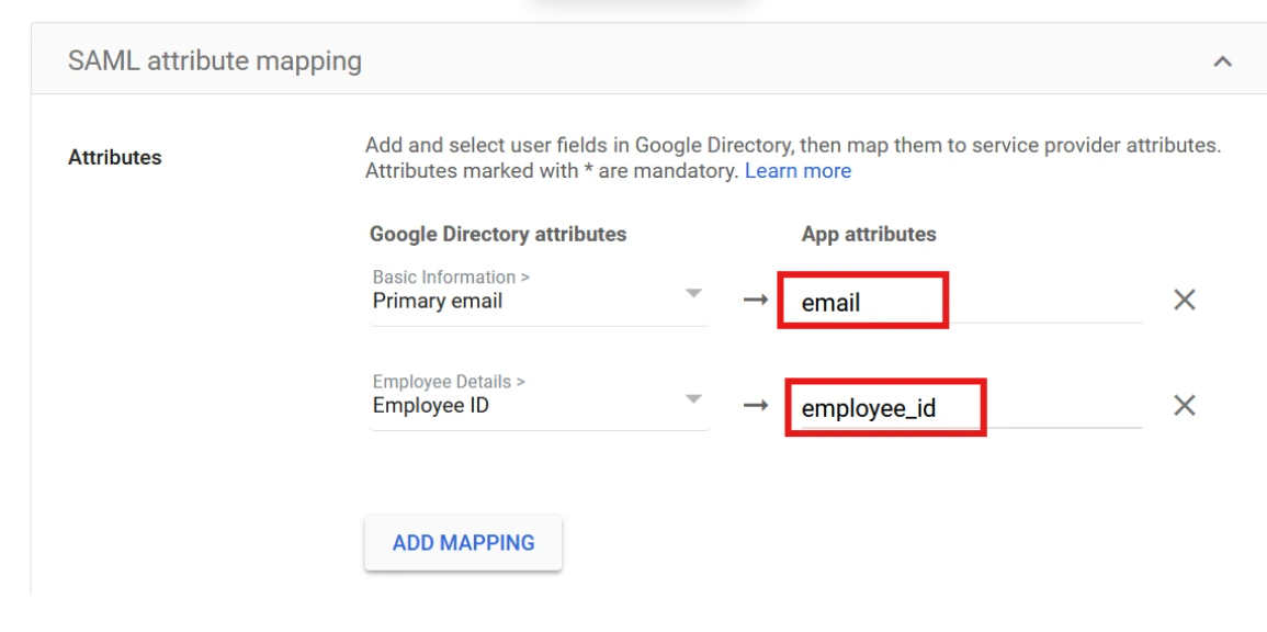 - In Google Workspace SAML attribute mapping, click Add Mapping to add an attribute with a unique, unchanging value for each user, such as employee_id.